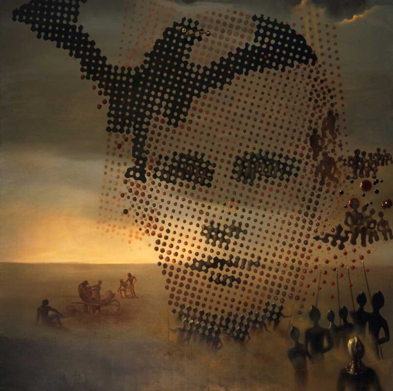 The portrait is not just a tribute, but an act of fusion and separation, in which the two Salvadors coexist and annihilate each other, united by a single molecule at the center of the nose, a symbol of the indissoluble bond and the struggle for identity. Dalí, with his unparalleled theatricality, asserted that he had to constantly assassinate the image of his brother: “Every day, I kill the image of my poor brother […] I assassinate him regularly, for the ‘Divine Dali’ cannot have anything in common with this former terrestrial being”.