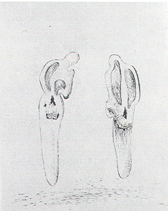 The umbrella, according to Dalí, attempts to hide its state of erection behind a “shameful hat”, while the sewing machine proclaims the “mortal and cannibalistic virtue of its needle”, identifying with the praying mantis that devours the male after the “paroxysmic” act.