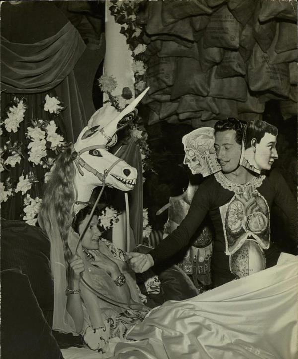 At that ball, Dalí transformed a party into a three-dimensional nightmare-dream. Gala appeared in a bed, wearing a stuffed lion’s head, while guests moved among shattered mannequins and tables supported by human legs.